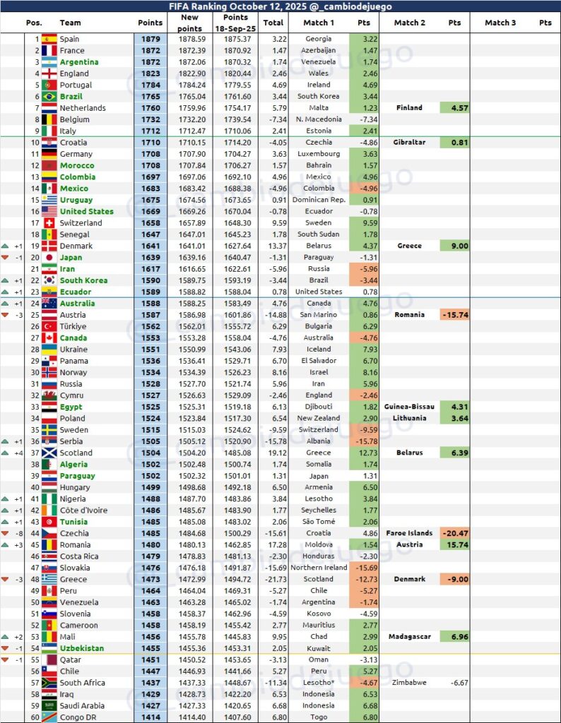 La derrota de Selección de fútbol de Austria ante Selección de fútbol de Rumania (1-0) provocó un importante movimiento en el ranking FIFA: Selección de fútbol de Ecuador escaló al puesto 23 con 1.588 puntos y se ubica dentro del bombo 2 de cara al sorteo de la Copa del Mundo 2026.